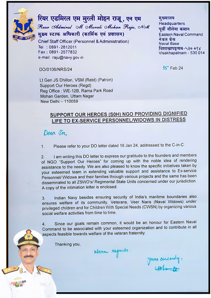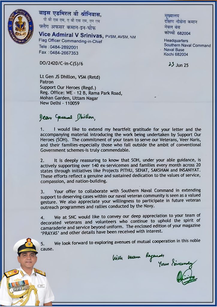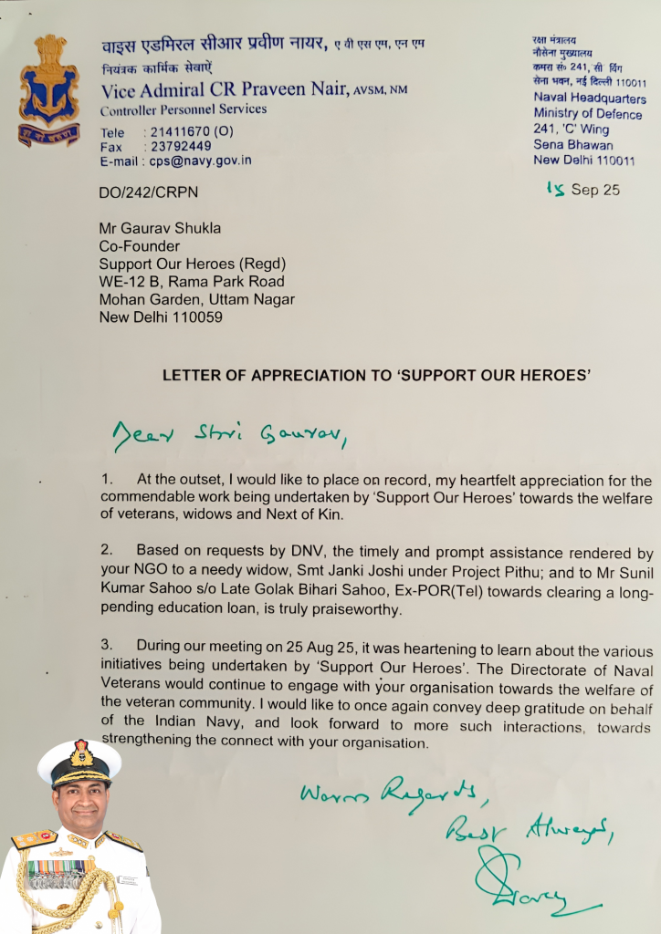 “I would like to place on record my heartfelt appreciation for the commendable work being undertaken by ‘Support Our Heroes’ towards the welfare of veterans, widows and Next of Kin. On requests by Directorate of Naval Veterans, the timely and prompt assistance rendered by your Organization to the needy families is truly praiseworthy.”