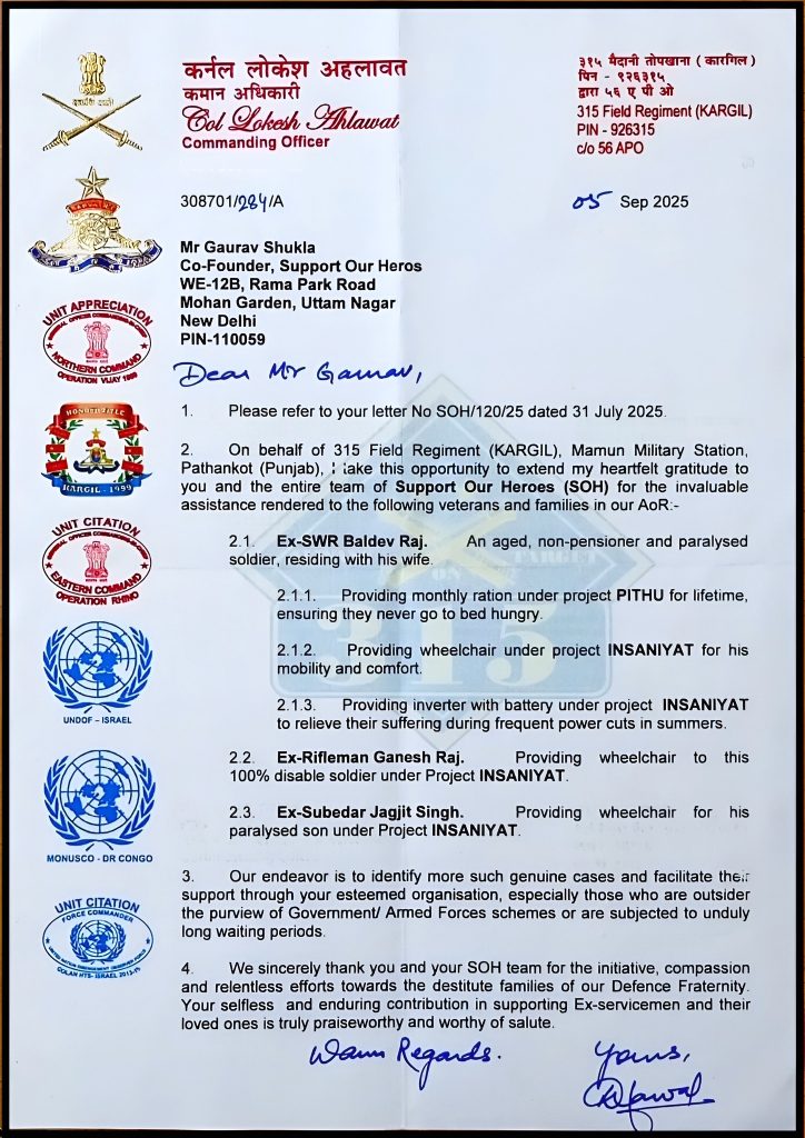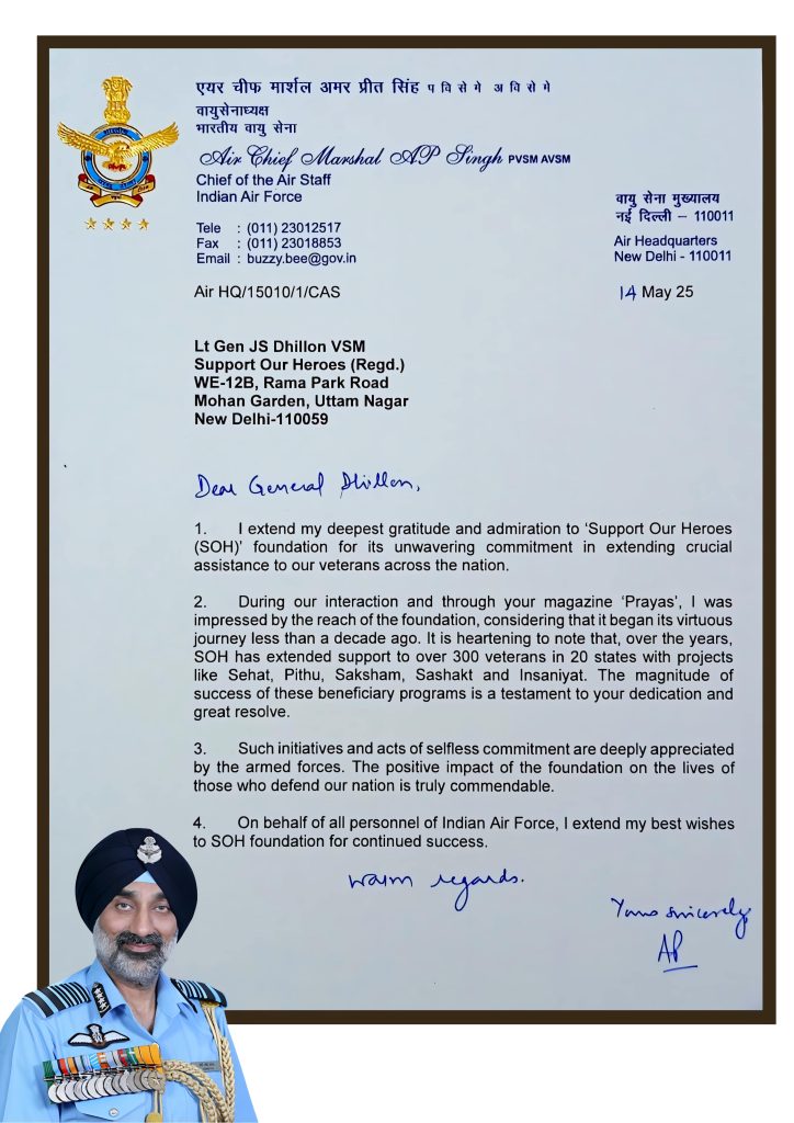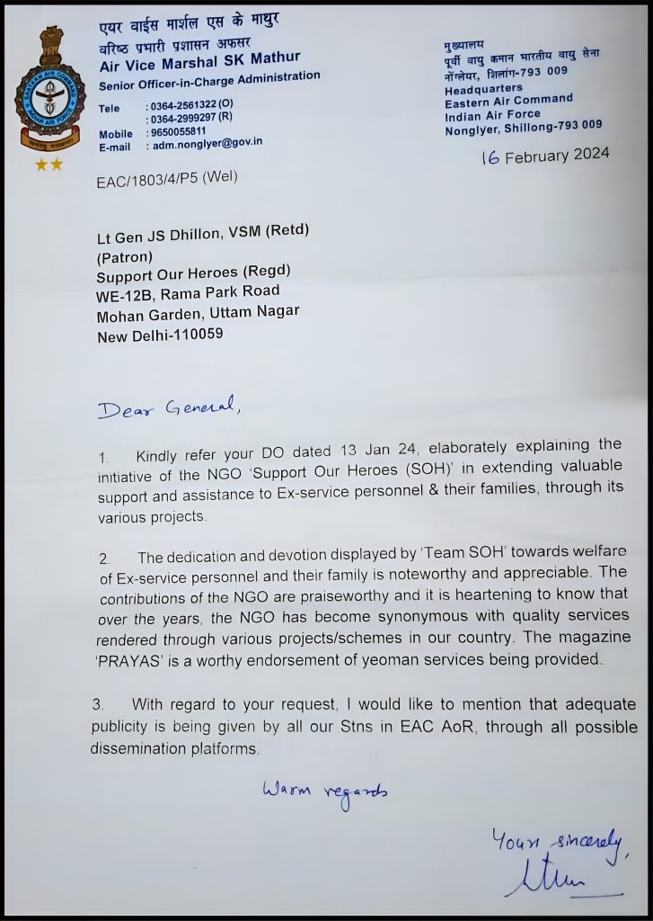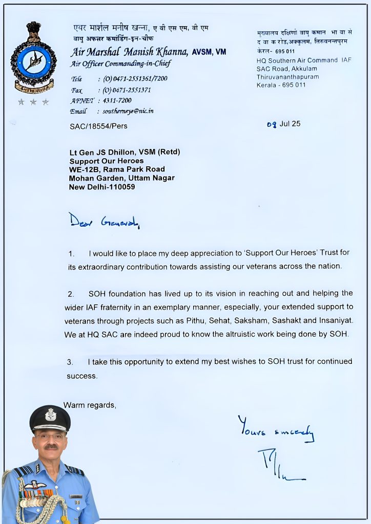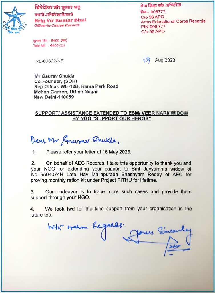 “I am writing this DO letter to express our gratitude to the founders and members of NGO “Support Our Heroes” for coming up with the noble idea of rendering assistance to the needy. We are also pleased to know the specific initiatives taken by your esteemed team in extending valuable support and assistance to Ex-service Personnel/ Widows and their families through various projects.”