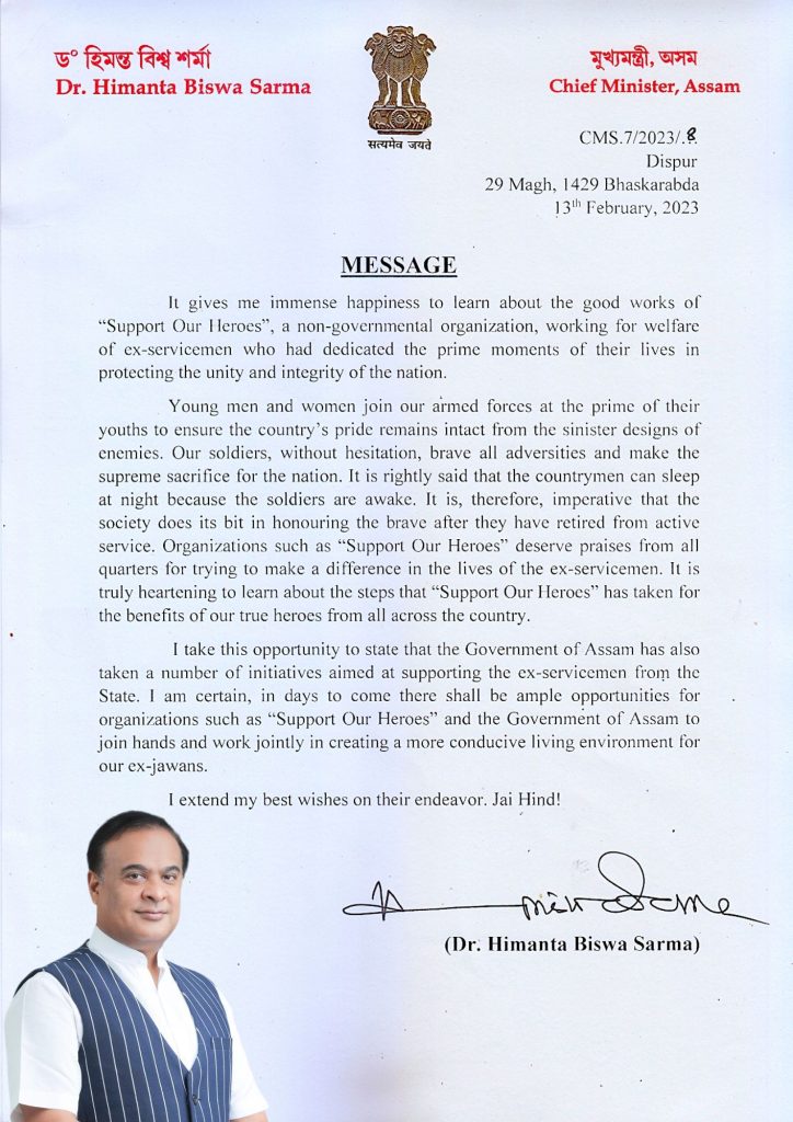 “The ‘Support Our Heroes’ have done a commendable jobs for welfare and wellbeing of Ex-Servicemen, dependent families and Widows of the Assam.”