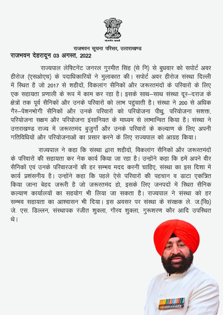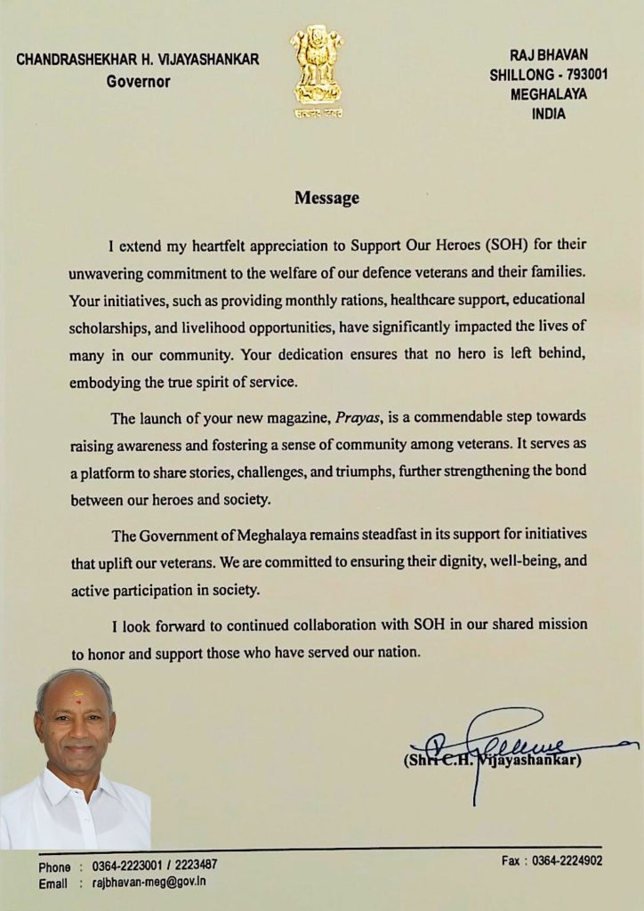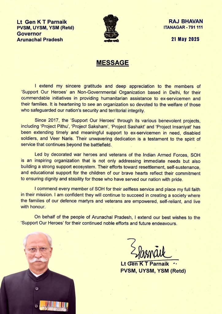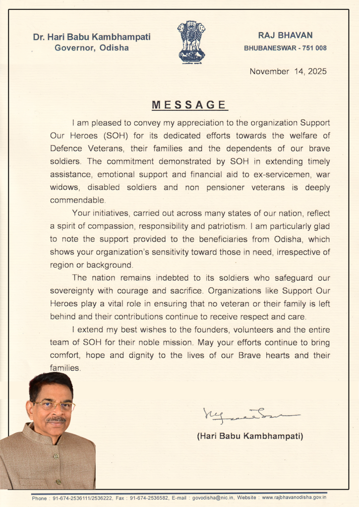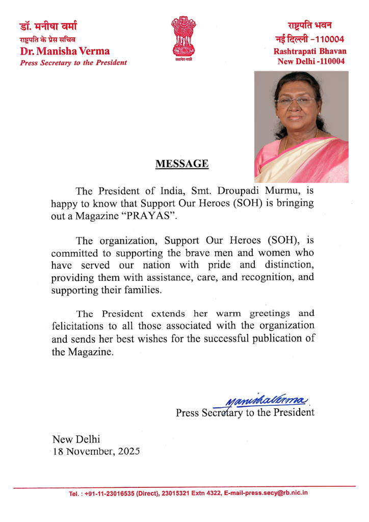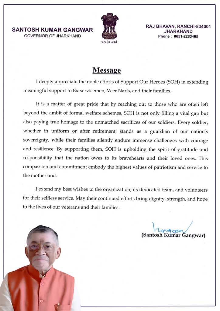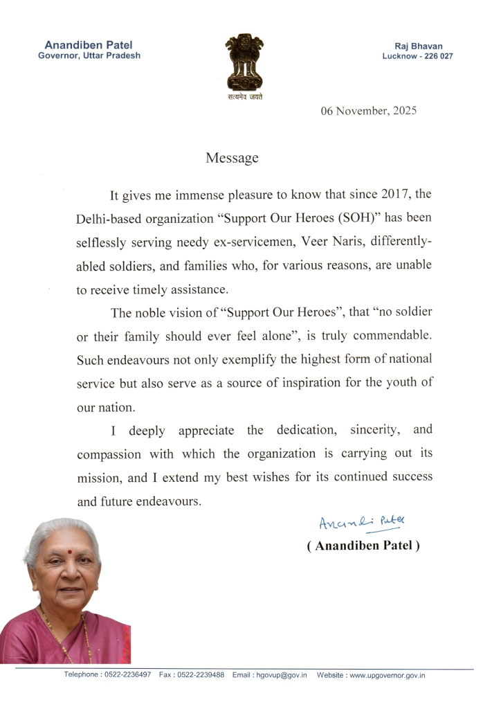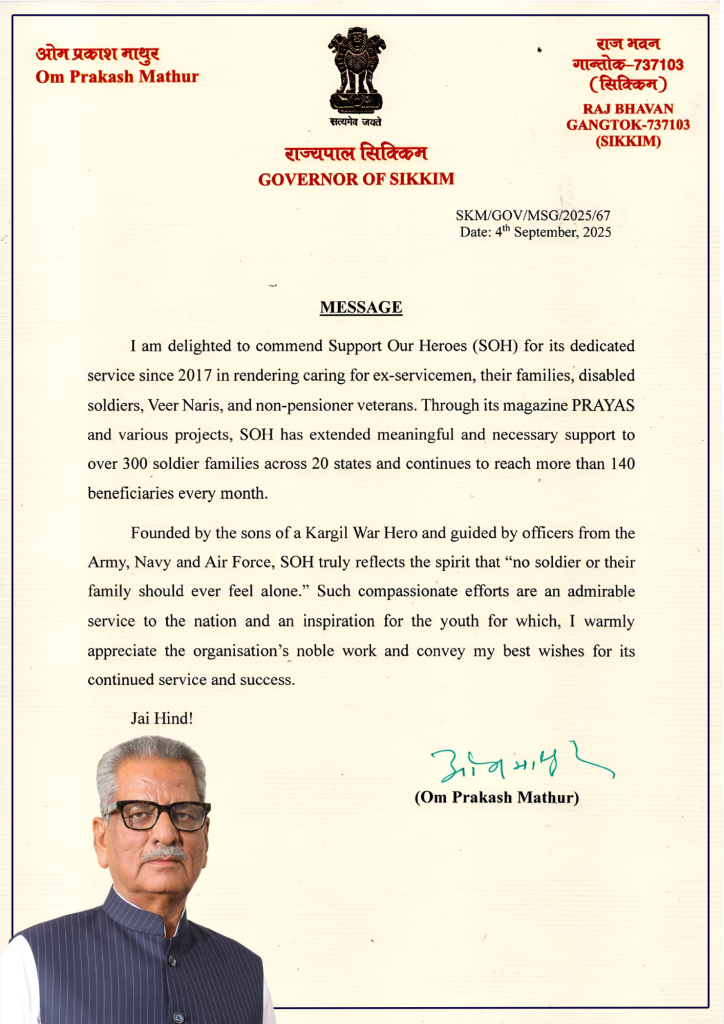 “It is heartening to learn that Support Our Heroes (SOH) has taken the noble initiative to provide timely assistance to Ex-servicemen, war widows (Veer Naris), disabled soldiers, medically boarded-out trainees and non-pensioner veterans. Through financial, medical and educational support, SOH is bringing meaningful change to the lives of those who have served the nation.”