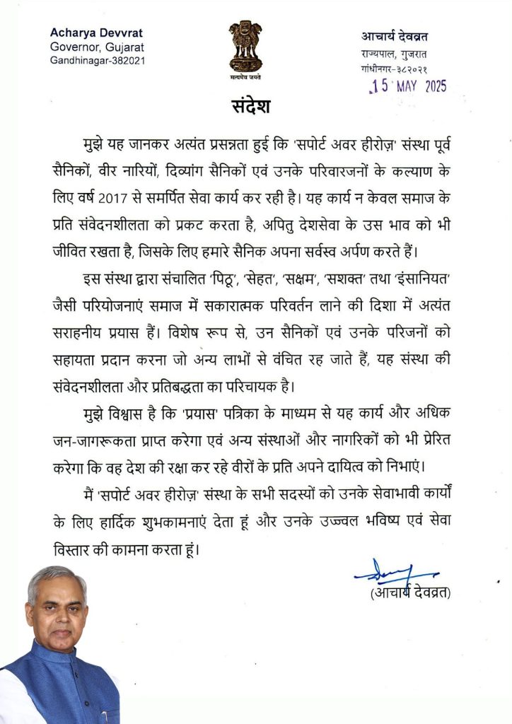 “मुझे यह जानकर अत्यंत प्रसन्नता हुई कि ‘सपोर्ट अवर हीरोज़’ संस्था पूर्व सैनिकों, वीर नारियों, दिव्यांग सैनिकों एवं उनके परिवारजनों के कल्याण के लिए वर्ष 2017 से समर्पित सेवा कार्य कर रही है। यह कार्य न केवल समाज के प्रति संवेदनशीलता को प्रकट करता है, अपितु देशसेवा के उस भाव को भी जीवित रखता है, जिसके लिए हमारे सैनिक अपना सर्वस्व अर्पण करते हैं।.”