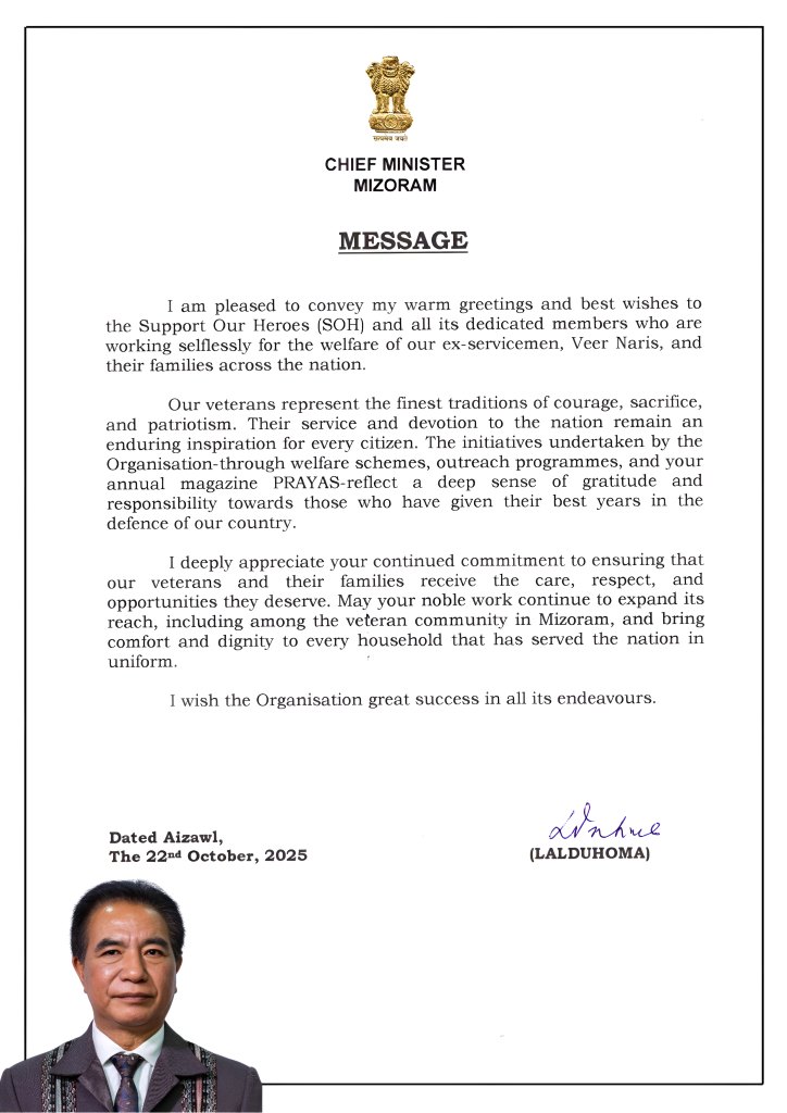 May your noble work continue to expand its reach, including among the veteran community in Mizoram and bring comfort and dignity to every household that has served the nation in uniform.“